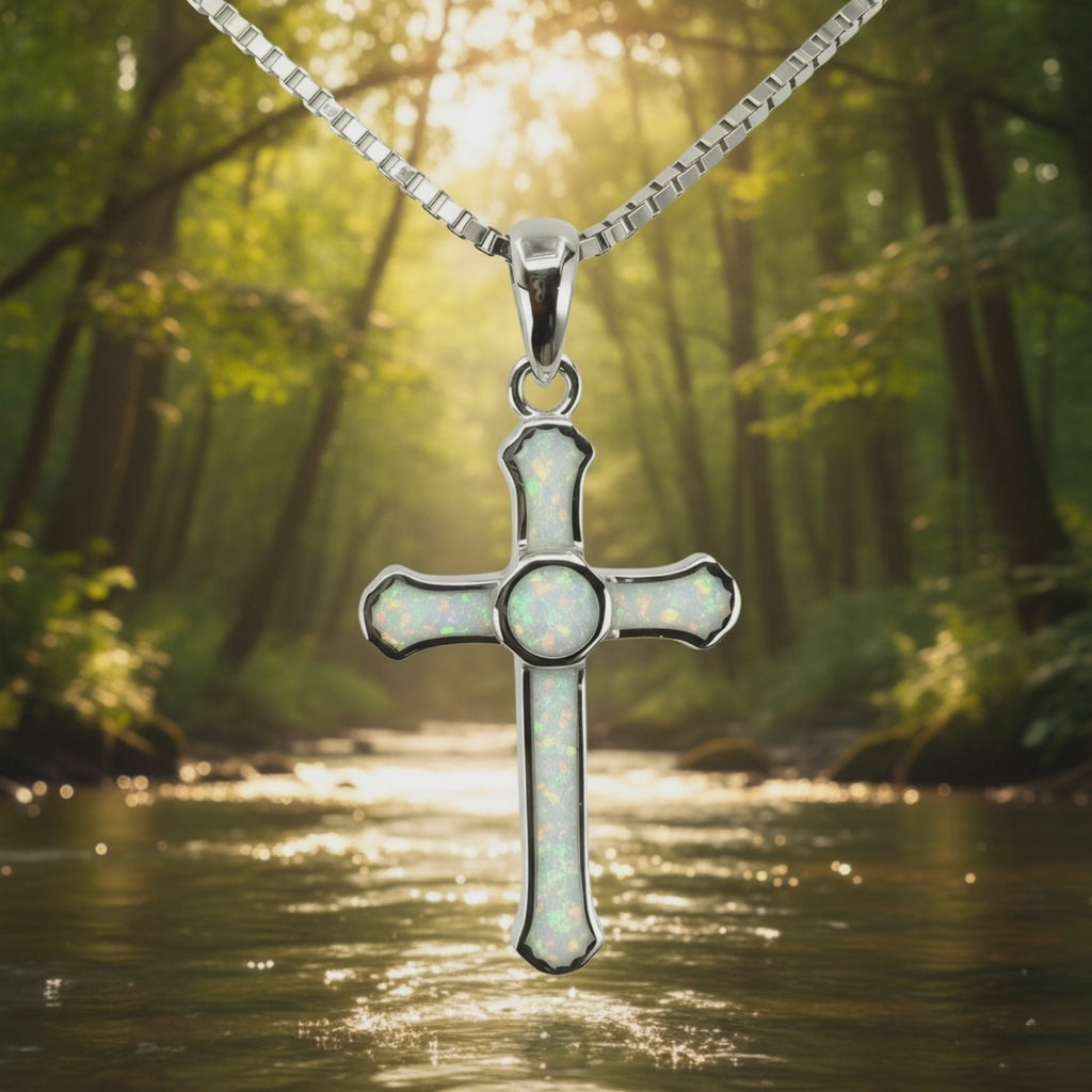 Opal & Silver Necklace of Faith — Cross is a Talisman of Light, Protection & Devotion. Opal is a muse of intuition and renewal. Its shifting fire reflects inner truth, calms the heart, and invites clarity on the spiritual path.