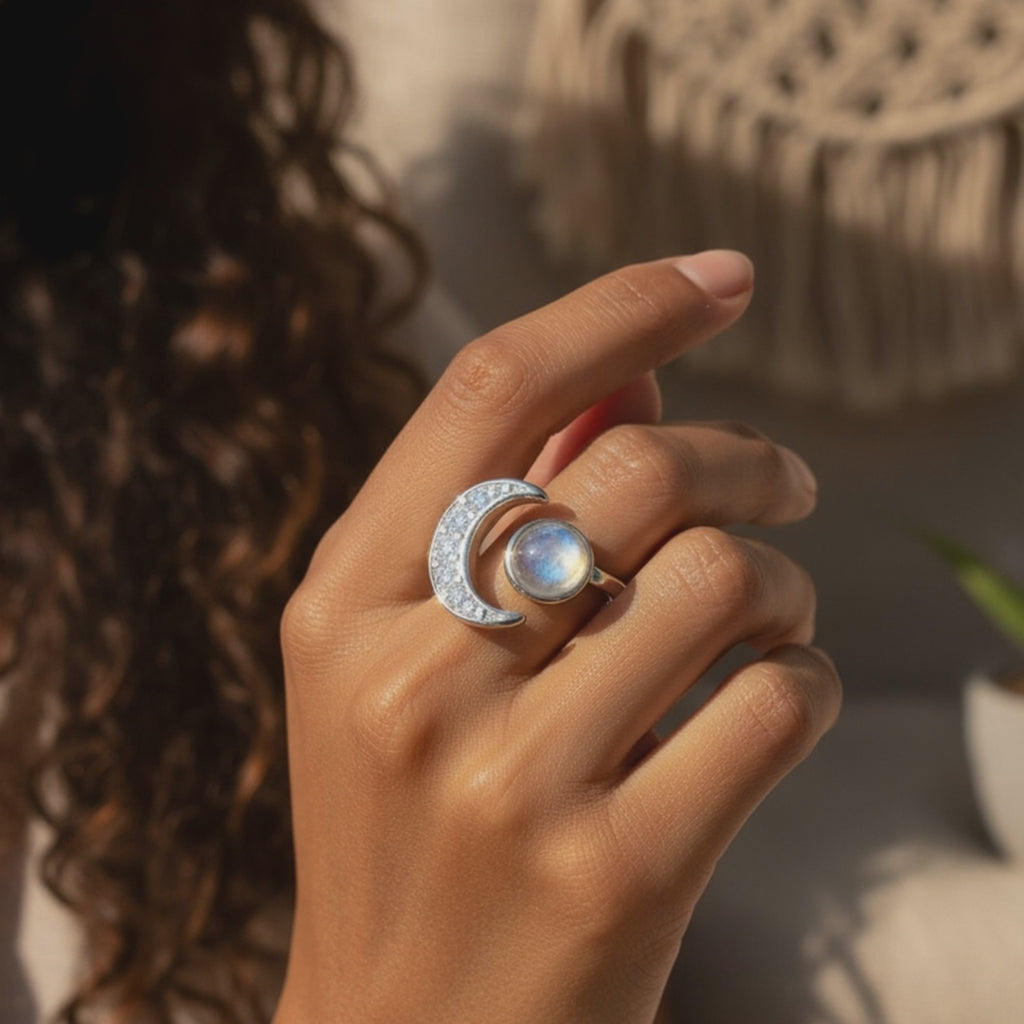 Moonstone & Silver Lunar Ring is a Talisman of Lunar Wisdom, Renewal & Divine Feminine Energy. A luminous Moonstone cabochon is framed by a minimalist moon phase motif—honoring the polarity of New Moon (beginnings) and Full Moon (illumination).