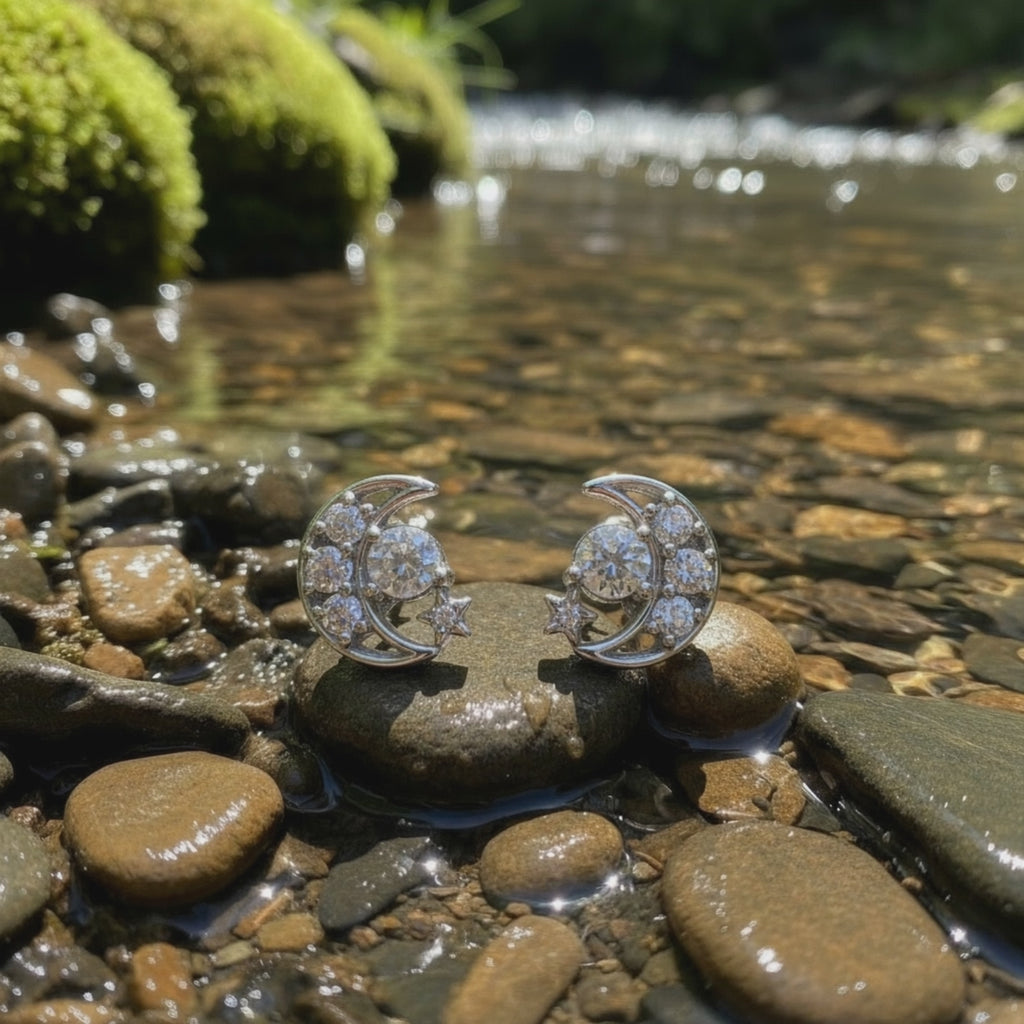 The Moonstone & Silver Celestial Stud Earrings are a Trinity of Lunar Wisdom, Stellar Guidance & Vitality.